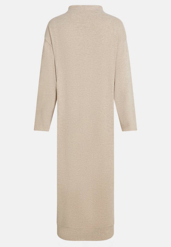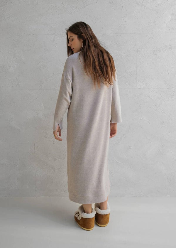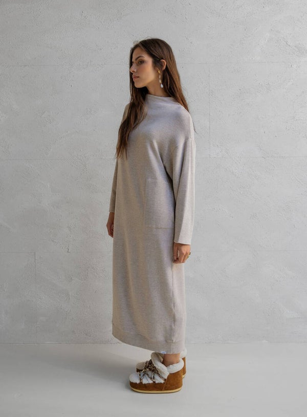 Dieses Kleid hat einen Rundhalsausschnitt, eine aufgesetzte Tasche vorne und lange Ärmel.