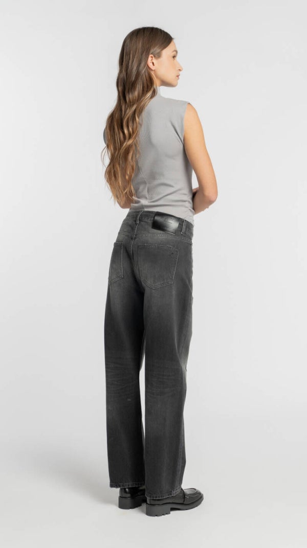 Die Denimhose besteht aus 100% Baumwolle.